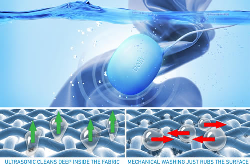「Dolfi」は超音波で汚れを落とすポータプル洗濯機。大きさは充電カイロや携帯電話くらいで持ちはこびラクラク。